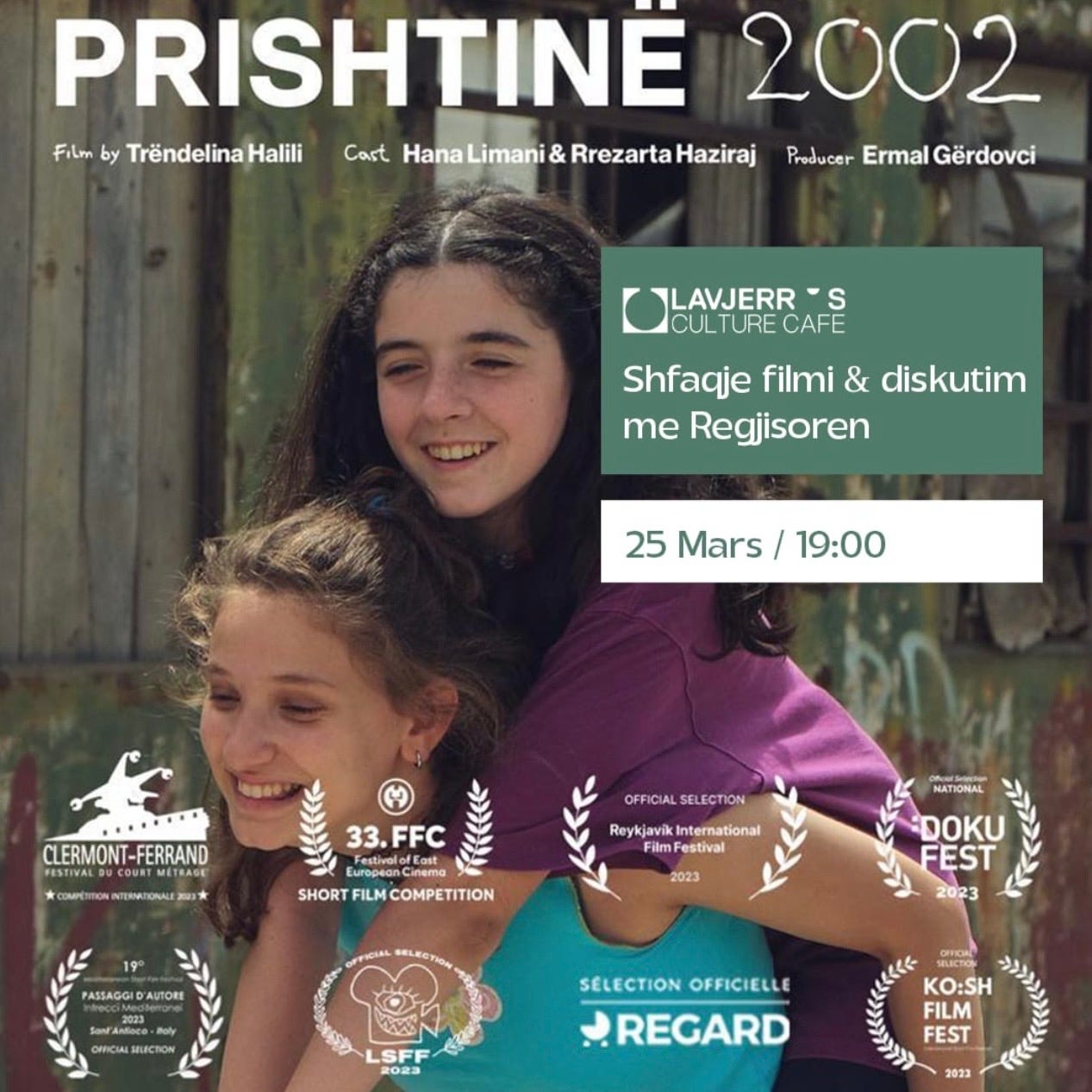Filmi i shkurtë “Prishtinë 2002”, me regji nga Trëndelina Halili, vjen në një mbramje të veçantë në Lavjerr's Culture Cafe, ku filmin mundeni me këqyr e masnej edhe me diskutu. Ky osht një rrëfim emocional për miqësinë, fëmijëninë dhe realitetin e pasluftës në Prishtinë, i vlerësum në plot festivale ndërkombëtare të filmit. Natyrisht, mas shfaqjes, mundeni mu bashku në një diskutim me regjisoren për me zbuluar historinë pas filmit. Data osht 25 mars, ora 19:00.